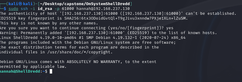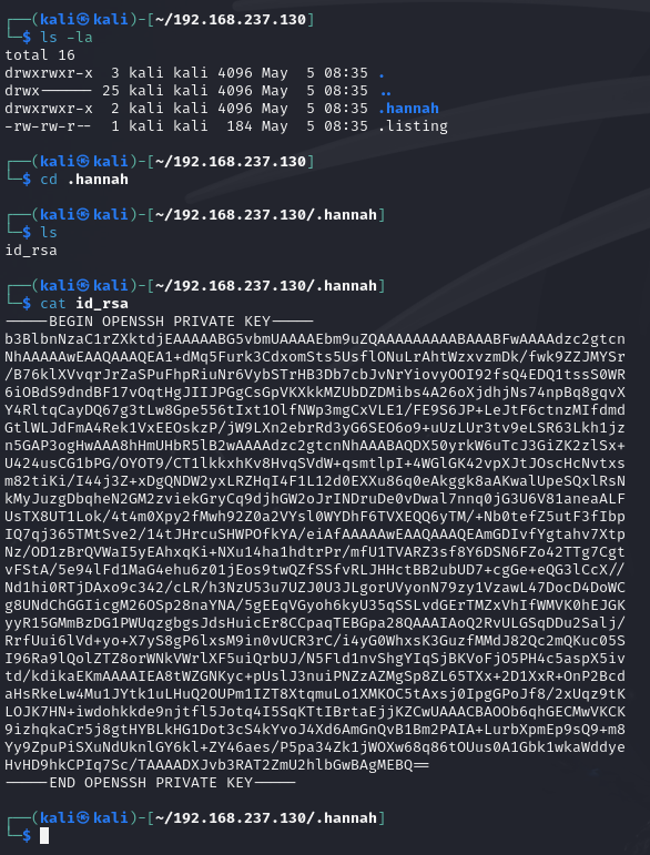 Inside the hannah directory is a RSA key for SSH, lets use this to log into the server...