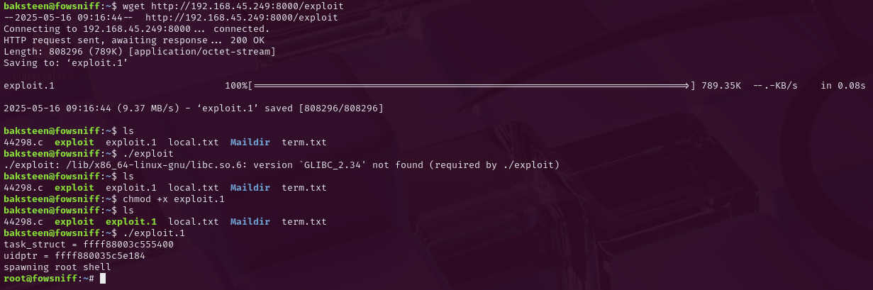- Compile and execute the kernel exploit to gain root access and demonstrate full system control.