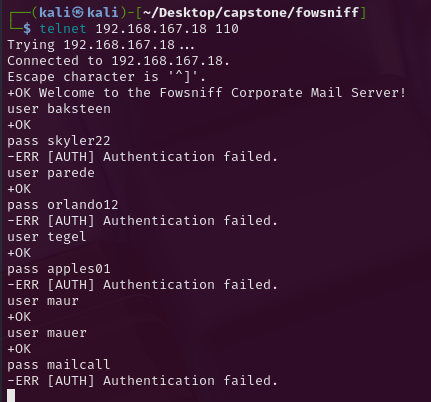 - Crack the discovered password hashes using john and leverage them to access the POP3 mail service.